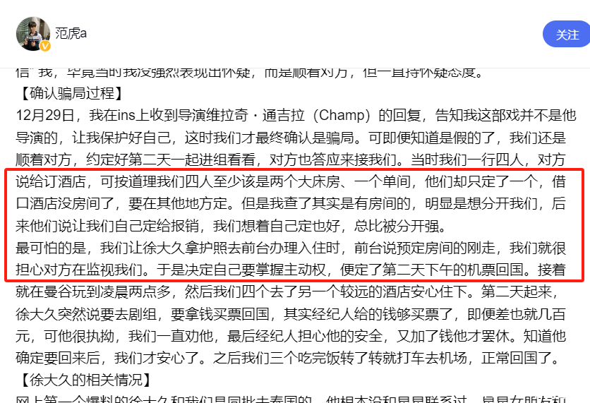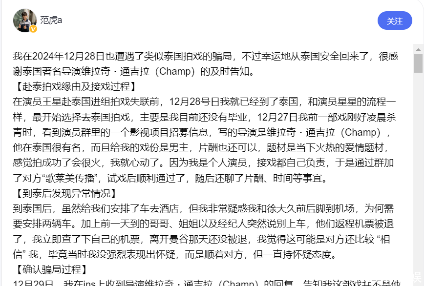 因此,在2024年12月29日,范虎光棍一东谈主治装开拔,受到自称为泰国剧组的邀约,起程从北京飞往泰国曼谷。