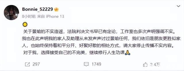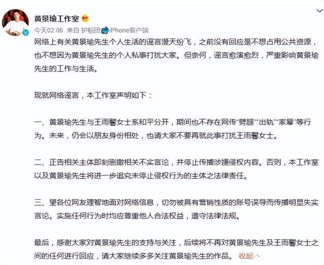 事情莫得赢得科罚,也就缓缓的被文娱圈中其他琐事障翳。之是以再次发酵,是因为狗仔6月17日再次曝出黄景瑜和王雨馨的灌音,同期喊话请黄景瑜放过王雨馨。大略是不胜其扰,黄景瑜的责任室,于6月20日凌晨发出声明。否定黄景瑜“出轨”“劈叉”“家暴”等步履,并恳请各人不要再惊扰王雨馨。同期王雨馨外交平台,也涌现好聚好散。两东谈主的交往追究落下帷幕。